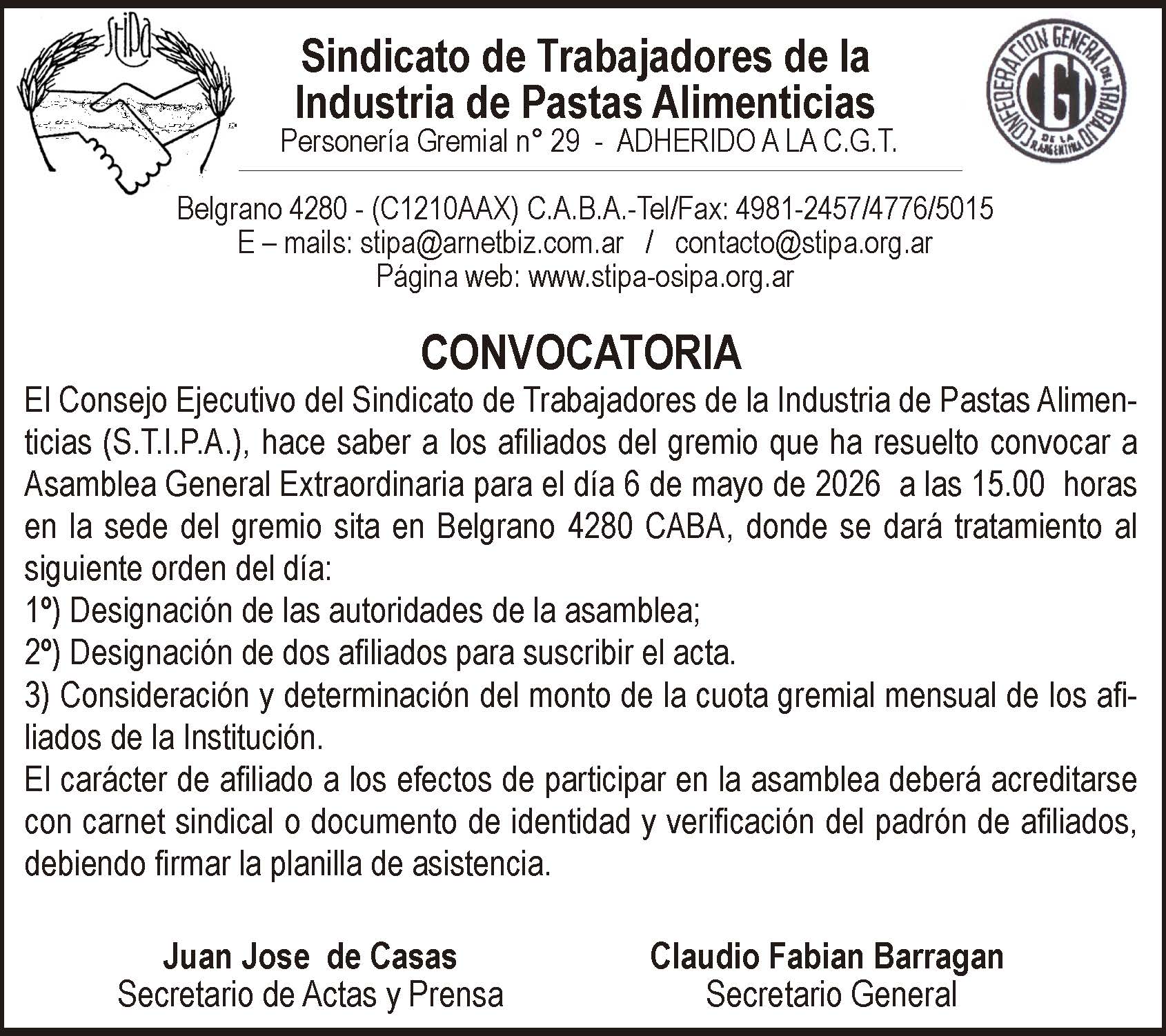 El Sindicato de Trabajadores de la Industria de Pastas Alimenticias (S.T.I.P.A) comunica que adhiere al paro nacional decretado por la Confederación General del Trabajo (C.G.T) para el día jueves 19 de Febrero de 2026, contra la reforma laboral, en defensa de los derechos individuales y colectivos de los trabajadores.