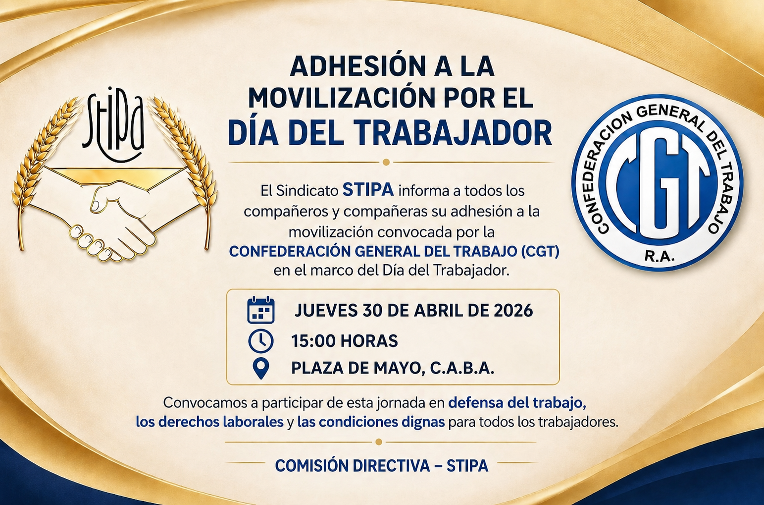 El Sindicato de Trabajadores de la Industria de Pastas Alimenticias (S.T.I.P.A) comunica que adhiere al paro nacional decretado por la Confederación General del Trabajo (C.G.T) para el día jueves 19 de Febrero de 2026, contra la reforma laboral, en defensa de los derechos individuales y colectivos de los trabajadores.